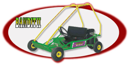 The Bandit II is the 2 seat version of the Bandit. This kart features the same 4HP Robin/Subaru engine with torque enhanced centrifugal clutch dual wheel drive, speed reduced to approximately 10mph. A great entry level kart for those youngsters in the 6-10 year old age bracket, where the parents are looking at two youngsters riding in a slow and safe kart with safety lap belts and overhead bars. A perfect way to safely get started at only $699.